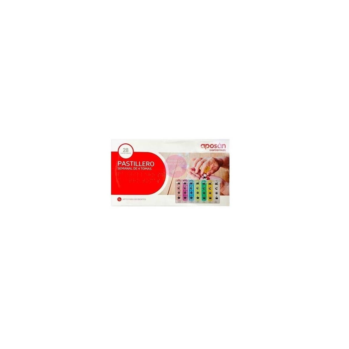 Pastillero semanal con 4 tomas para cada día: desayuno, comida, cena y antes de dormir Marcada cada toma de forma sencilla con dibujos y en braille para poder detectar facilmente cada toma. Cada día de la semana en un color.