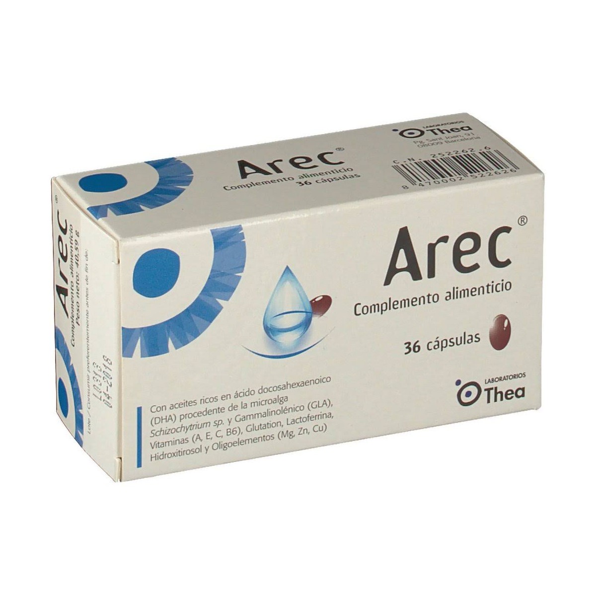 Arec 36 Cápsulas es un complemento alimenticio diseñado con DHA, GLA y vitaminas que aportan las necesidades diarias de nutrientes para mejorar el estado de la mucosa ocular.