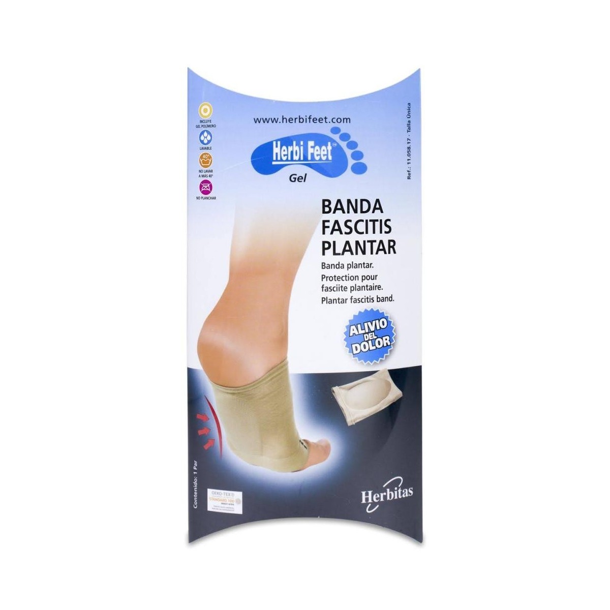 Herbitas banda fascitis plantar está indicada para el alivio del dolor en la zona media del pie y zona interna del talón (zona de inserción de la fascia plantar). Su diseño anatómico y su escaso grosor evitan los rechazos. Esta compuesta de gel polímero, aceite mineral y tejido elástico poliamida+elastómero.