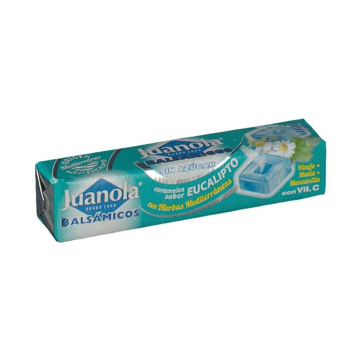 Caramelos balsámicos con vitamina C y hierbas mediterráneas con sabor a eucaliptus. Con edulcorantes y sin azúcares, aptas para diabéticos. Refrescan y suavizan la boca y la garganta y despejan las vías respiratorias.