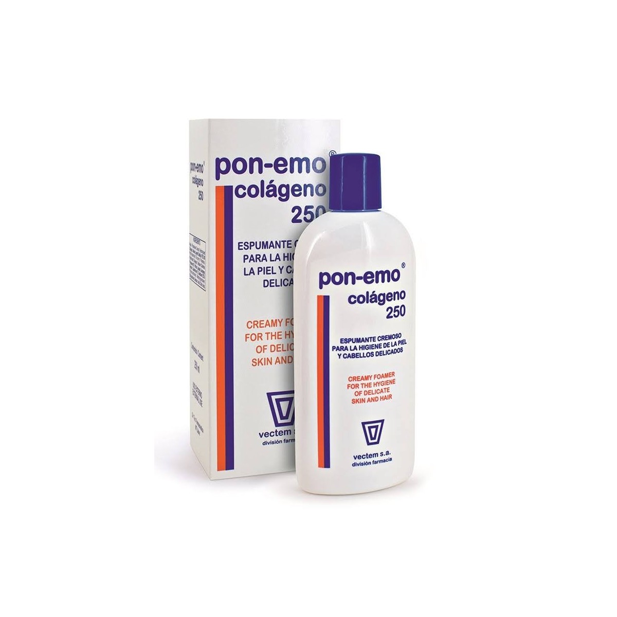 Pon-emo Colágeno 250. ¡Con Colágeno para reafirmar la piel!. Pon-emo Colágeno 250 es un gel dermatológico y champú de lipoproteínas para el cuidado e higiene diaria de pieles y cabellos delicados, sensibles e intolerantes a geles o Champús convencionales. Además, incorpora Colágeno hidrolizado que le confiere aún mayor tolerancia para la piel y la reafirma.